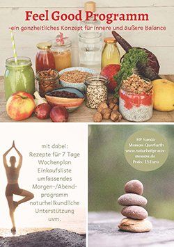 Wer das Bedürfnis nach einem Detox hat, welches die innere und äußere Balance wieder herstellt, dem empfehle ich mein Feel Good Programm. Darin enthalten sind Rezepte für eine Woche mit einer genauen Einkaufsliste und einer ganzheitlichen Morgen- und Abendroutine, die man während der Wellnesswoche und natürlich auch danach unterstützend durchführen kann.